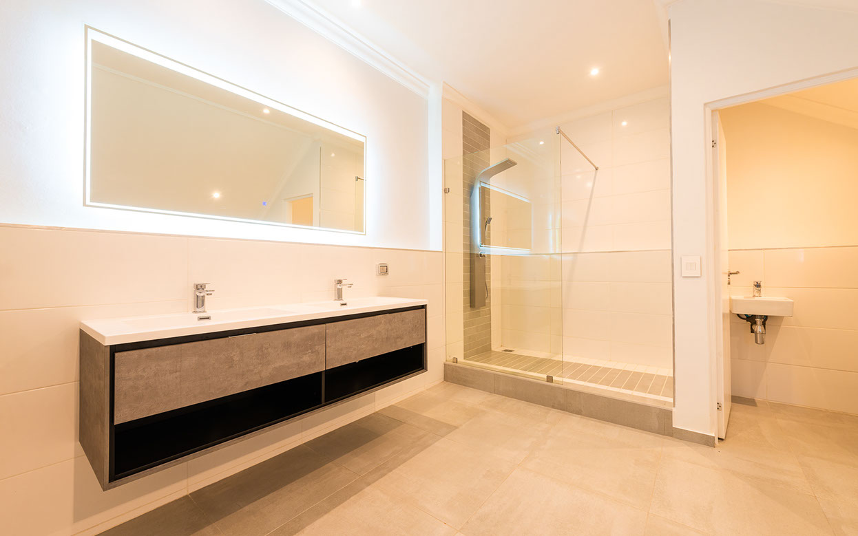 En suite master bathroom with a Hans Grohe Pharo Moonlight shower panel, Dornbracht taps, two glass tables containing stainless steel basins, and a separate WC with bidet, Geberit system and glass stand with stainless steel basin. All first floor showers are oversized, measuring 1,5 m x 1,5 m.