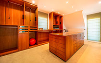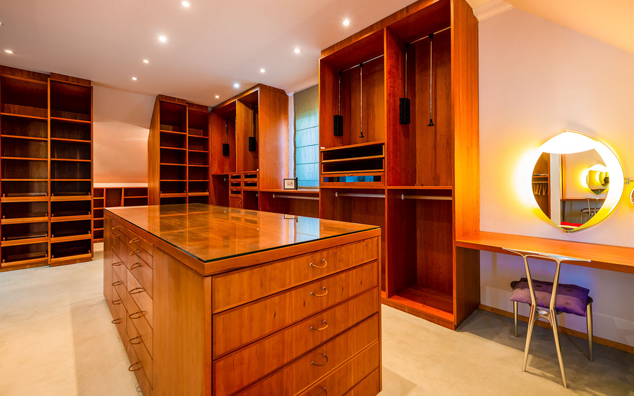 Master bedroom with a headboard and bedside tables, a bookshelf and two balconies. The walkthrough cherry-wood dressing area has ample hanging, shelving and shoe storage space, a dressing table with drawers and a laundry chute to the ground-floor laundry.