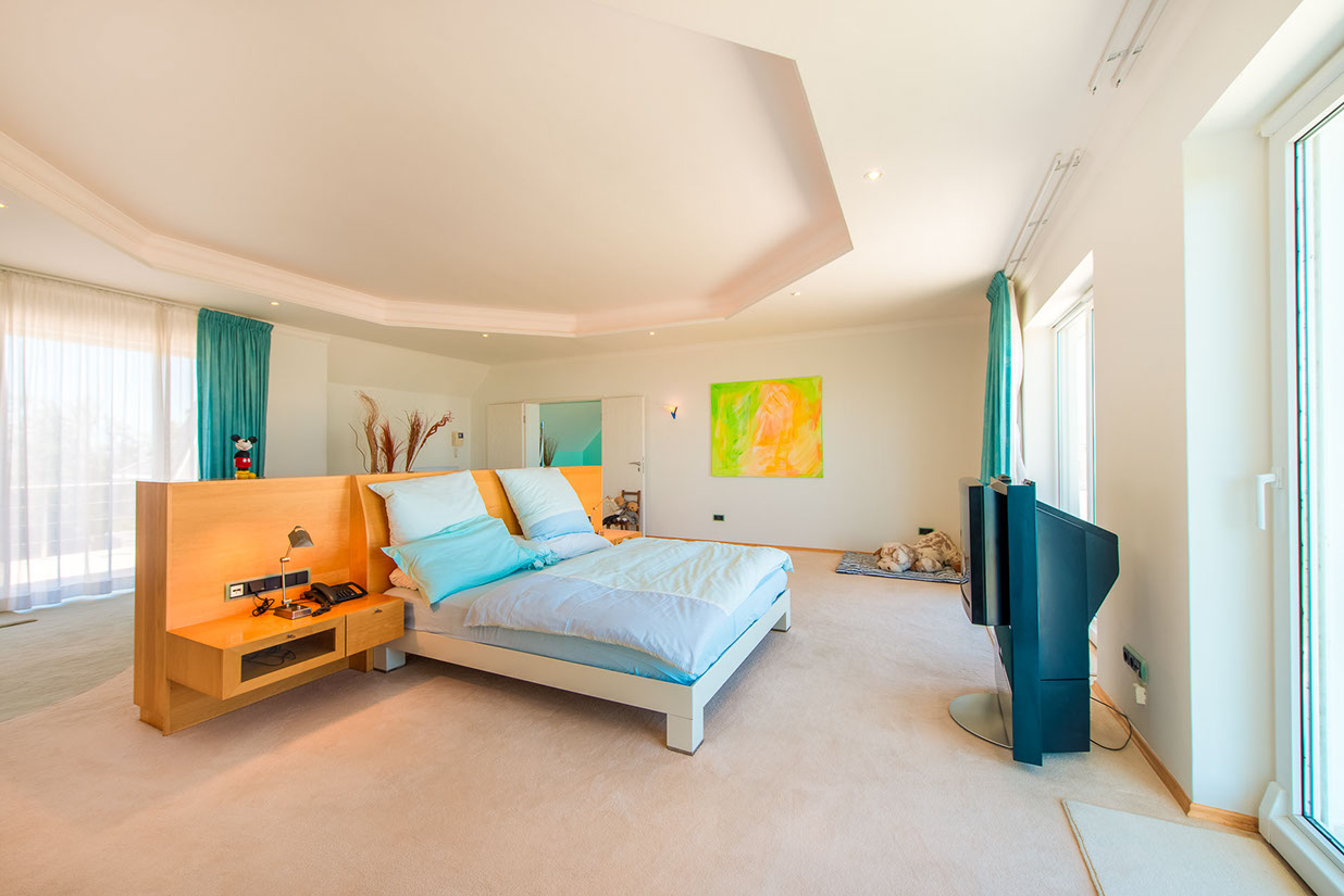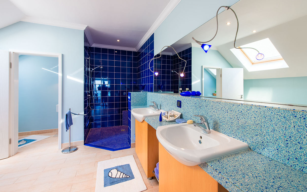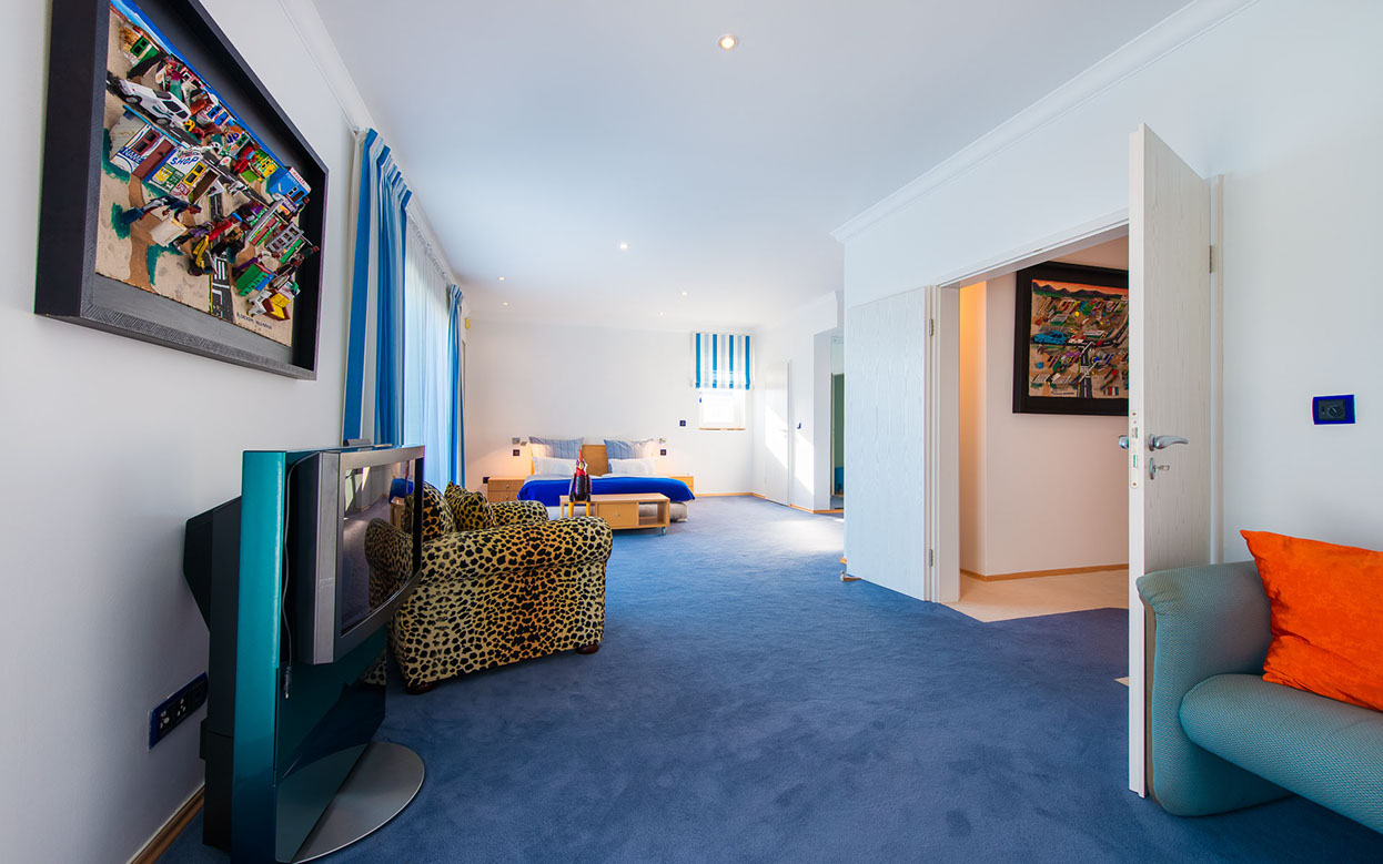 Guest room 2, the Blue Room, with a walk-in closet, a dressing table and a balcony. Its en suite bathroom has two basins, a shower with a Hans Grohe shower head, a bath, and a separate WC. The WC contains a basin and a WC with the Geberit system.