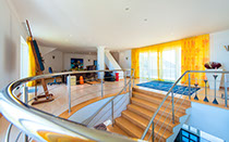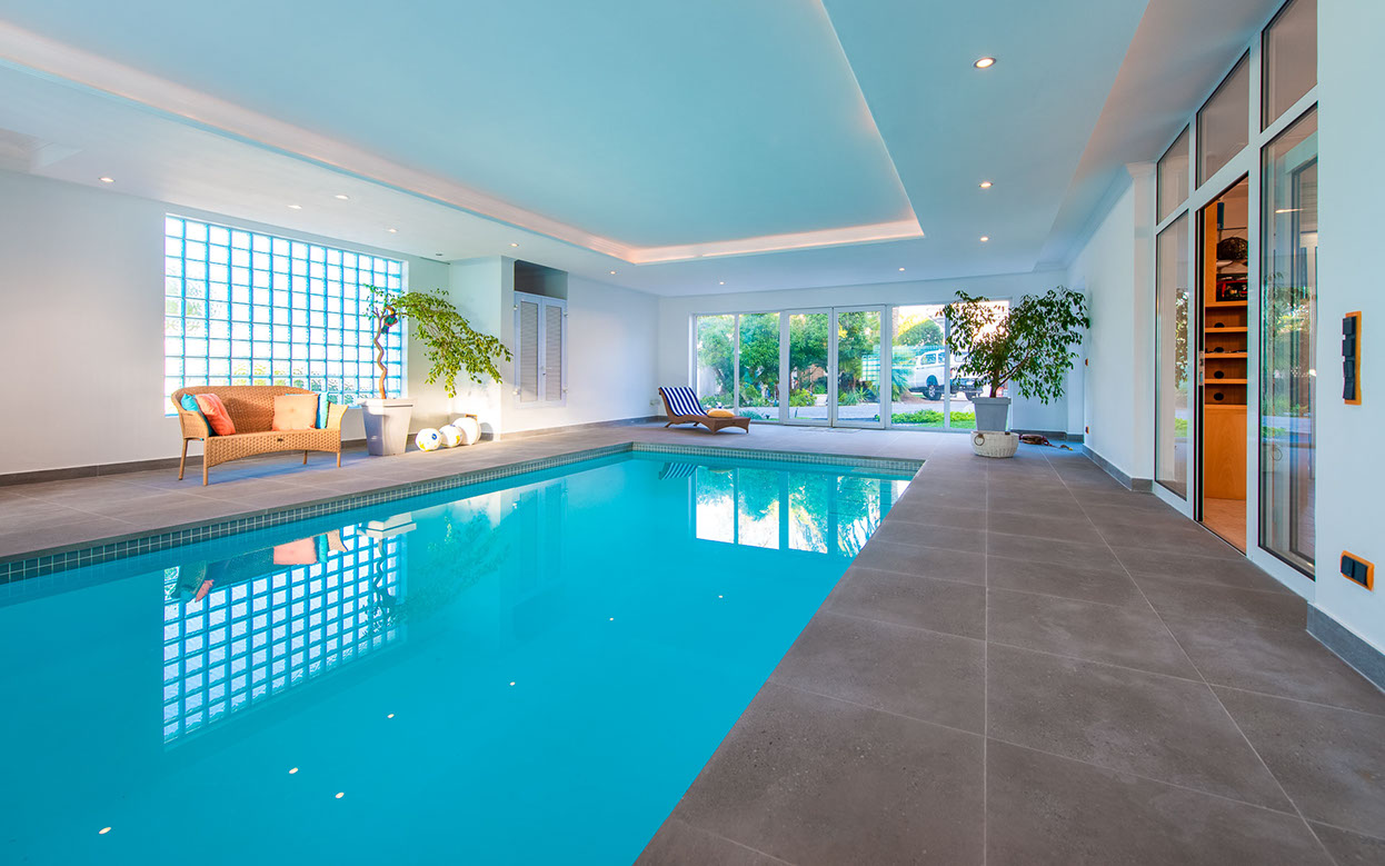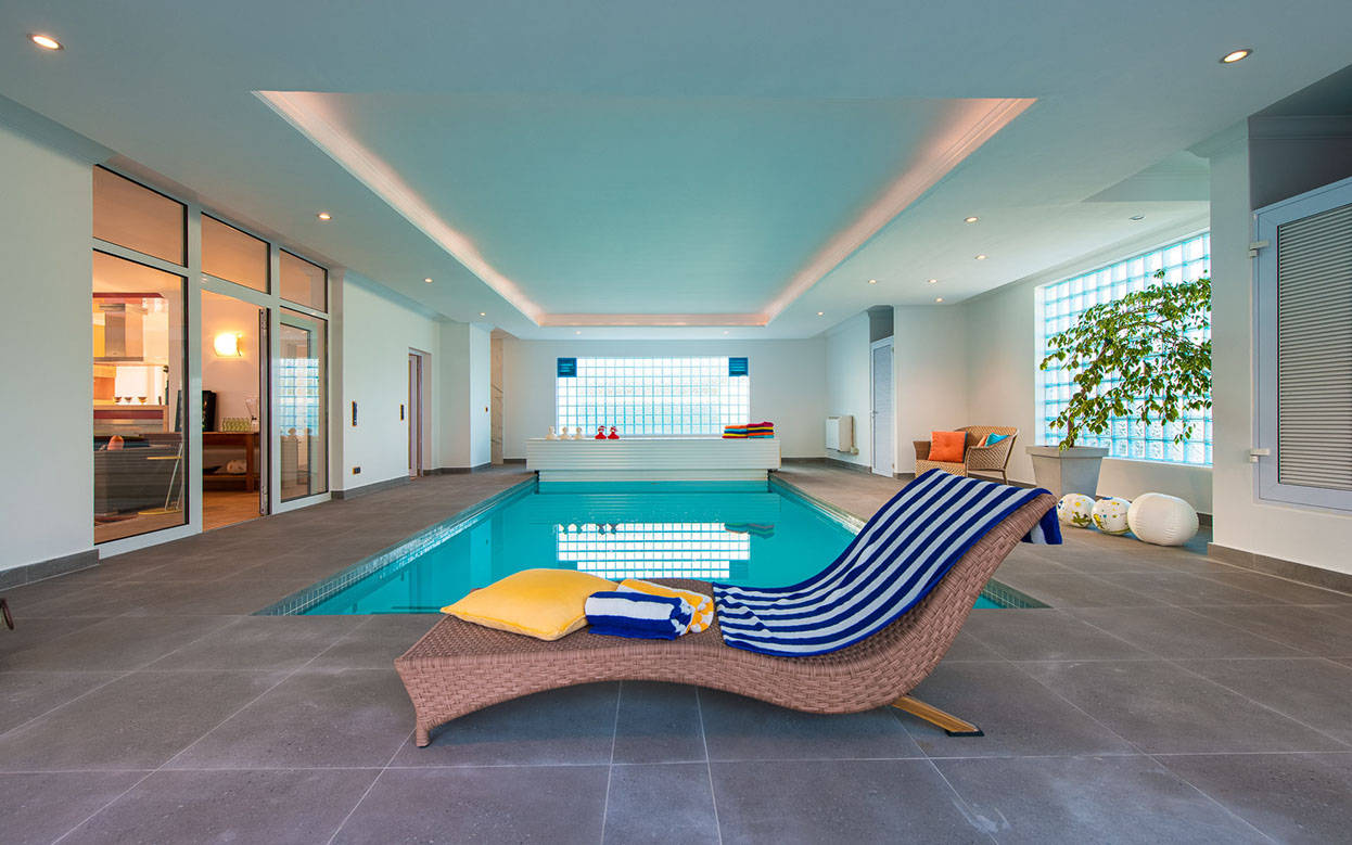 Indoor swimming pool area with large indoor pool, which is temperature-controlled through a solar heating system and a backup electrical system for cloudy days. The pool’s pump is indoors for convenience, but concealed behind doors. It also includes a shower area with a Hans Grohe shower head and Dornbracht taps, and a separate WC with the Geberit system, a urinal with a lid and a basin.