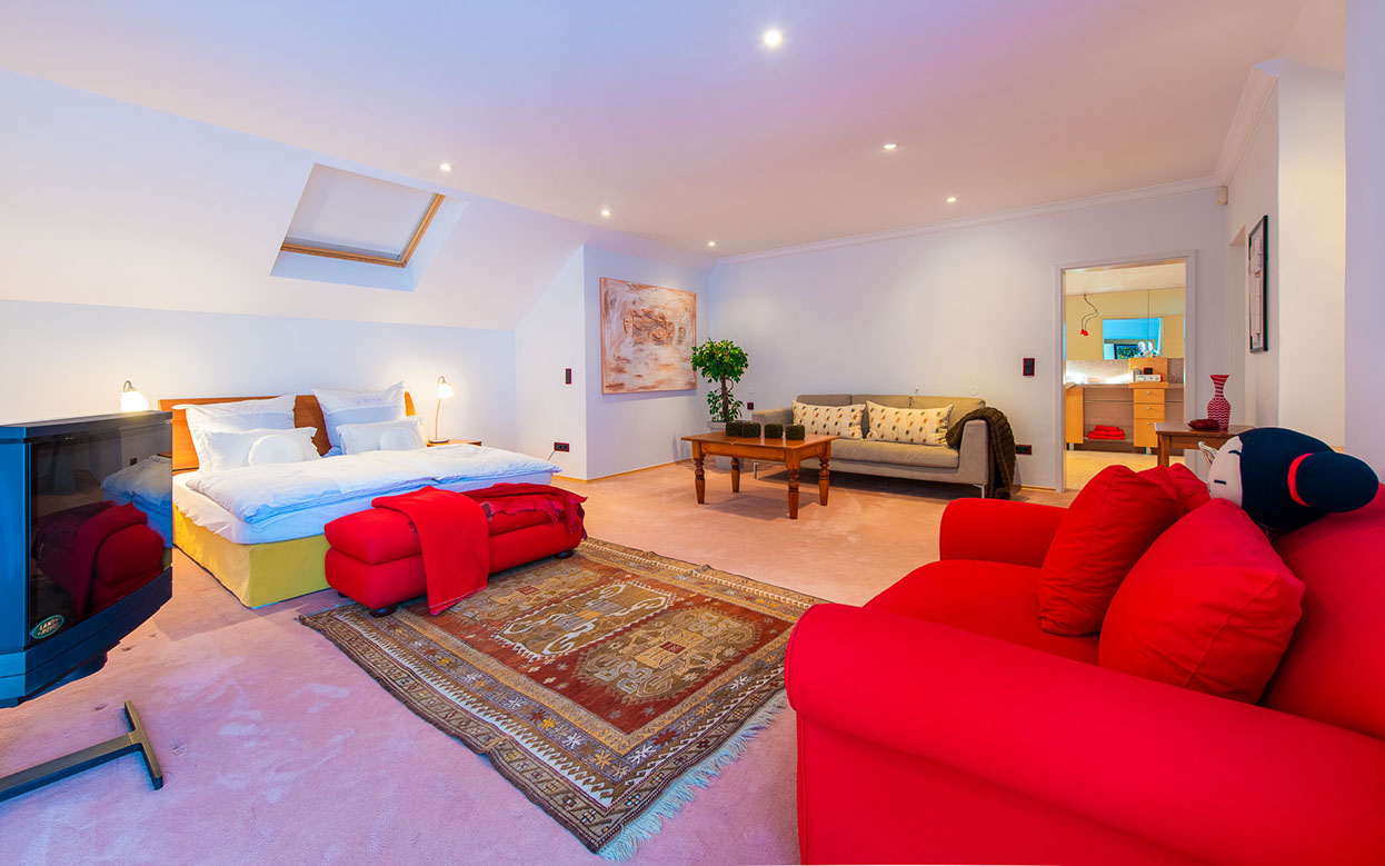 Guest room 3, the Red Room, also contains a walk-in closet, a dressing table and a balcony. Its en suite bathroom has two basins, a shower with a Hans Grohe shower head, a bath, and a separate WC. The WC contains a basin and a WC with the Geberit system.