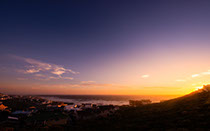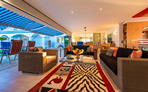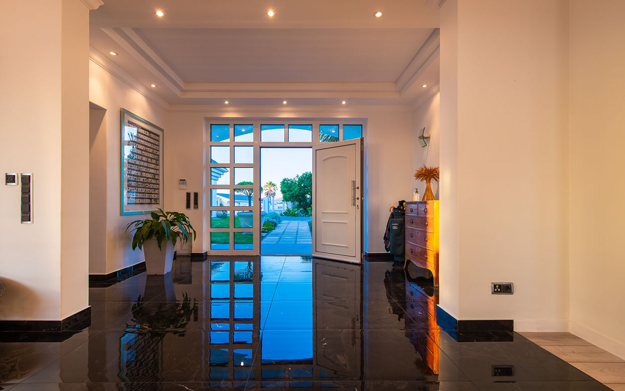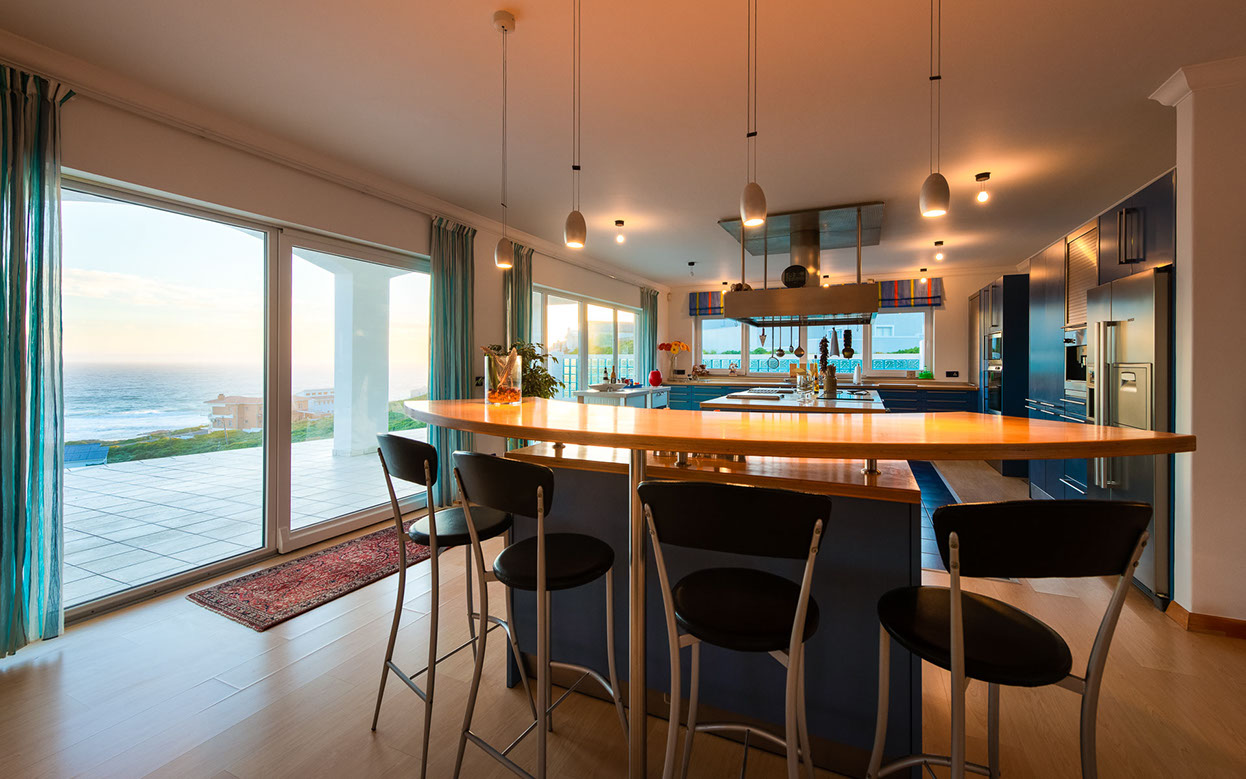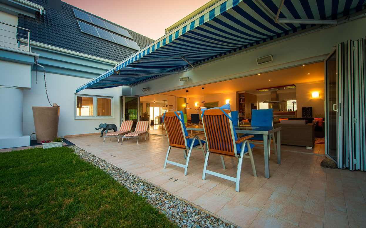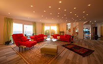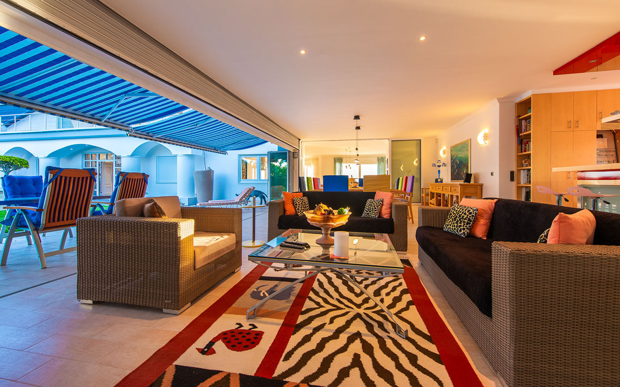 Entertainment area with a built-in Samsung TV and indoor roller shutters spanning a panoramic 9,8 m.
